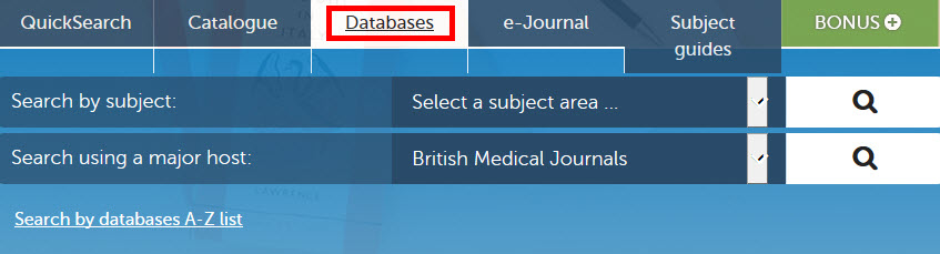 Select the Databases tab from the Library homepage. You can choose to use Search by database A-Z list, Search by subject or Search using a major host.