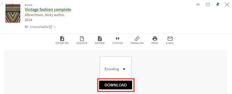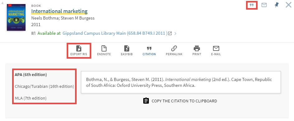 Click on the quotation marks icon, select your preferred referencing style and then click on Export RIS.