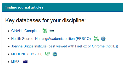 Staff in hospitals, clinics, and other health services will often have access to some of these databases, while professional organisations (such as the Australian Nursing and Midwifery Federation) might also offer database access to members.