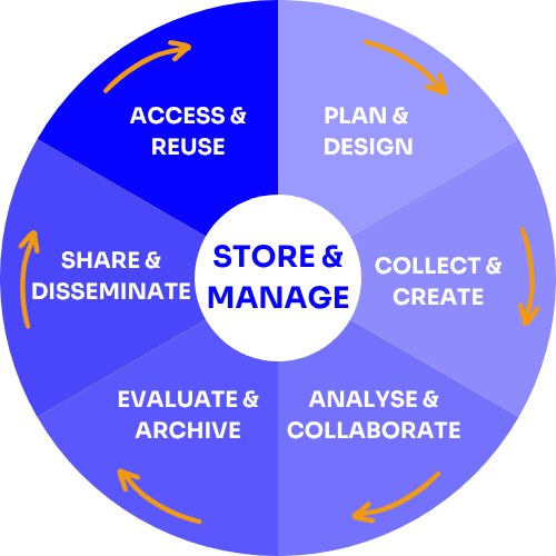 Plan & Design | Proper documentation is crucial for understanding and reusing data. This stage involves creating a Data Management Plan (DMP) which involves data security, data storage, planning for sensitive data, and awareness of institutional and funder policies. |